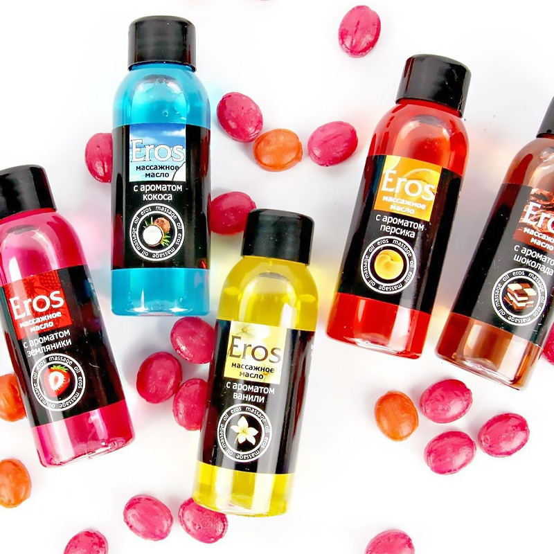 Массажные эротические масла EROS О пользе всех видов массажа знает каждый. И эротический в этом смысле также не является исключением. Немаловажную роль в этом процессе играют и массажные масла, которые положительно влияют на эмоциональное состояние. Они способны расслабить, возбудить, настроить на игривый лад. Представляем вашему вниманию съедобные массажные масла, имеющие уникальные качественные характеристики. Они помогают улучшить настроение, повысить чувствительность, позволяют ощутить мягкое тепло, делают кожу нежной и шелковистой, обеспечивают длительное скольжение, прекрасно смываются водой. Масла обладают приятными ароматами, которые создадут в комнате потрясающую атмосферу любви и чувственности.