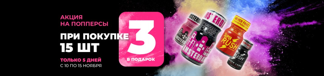 В магазине primegoods.kz проходит выгодная акция! При единовременной покупке 15 попперсов , 3 штуки получаете в подарок! Успейте сделать заказ на сайте primegoods.kz в период с 10 ноября по 15 ноября и воспользоваться выгодным приложением! Виды попперсов, которые принимают участие в акции:
