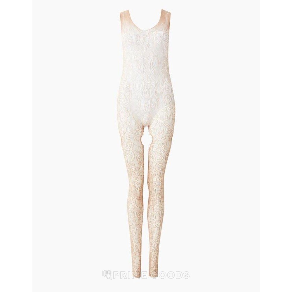 Полупрозрачный боди-комбинезон в бежевом цвете с разрезами на бёдрах и узорной сеткой. Эластичное полотно прилегает равномерно и подстраивается под силуэт в диапазоне S–L. В паховой зоне предусмотрен вырез. Плотность нити и рисунок создают визуальный эффект «голого тела» с ажурным декором, оставаясь незаметными под одеждой.