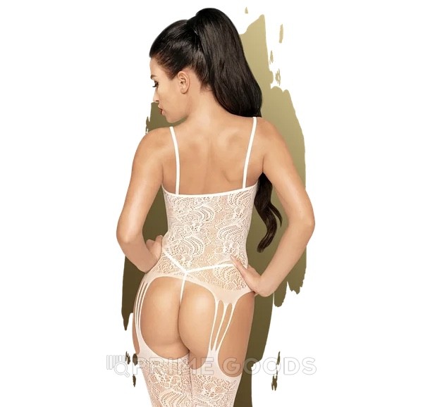 Бодисетка "Eye of the storm" от бренда Penthouse выполнена в белом цвете и представляет собой цельный комплект с декоративным верхом и имитацией чулок. Сетчатый материал и ажурные элементы подчёркивают фигуру, а вертикальные линии визуально вытягивают силуэт, делая его более стройным.