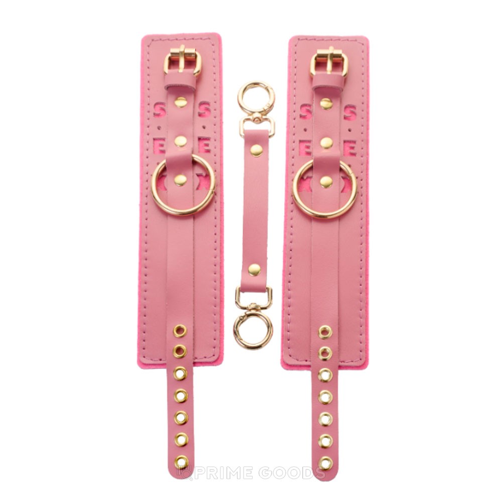 Розовые кожаные оковы с надписью «SEX» — символ дерзости и страсти. Внутренняя сторона, мягкий фетр, нежно касается кожи, даря комфорт при каждом движении. Надежная стальная фурнитура с золотистым покрытием придаёт аксессуару прочность и элегантность, а кожаный соединитель с двумя карабинами превращает оковы в универсальный инструмент для любых игр.