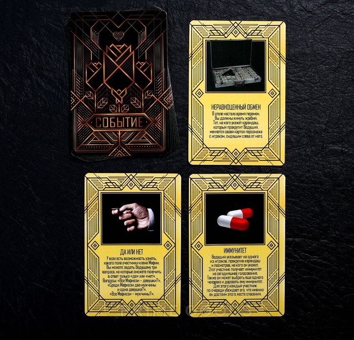 В комплекте 26 карт персонажей, 10 карточек событий и 5 сценариев для ведущего, а также 10 стильных масок и полные правила игры. Каждая партия разворачивается по уникальному сценарию, где роль и цель у каждого участника — свои.