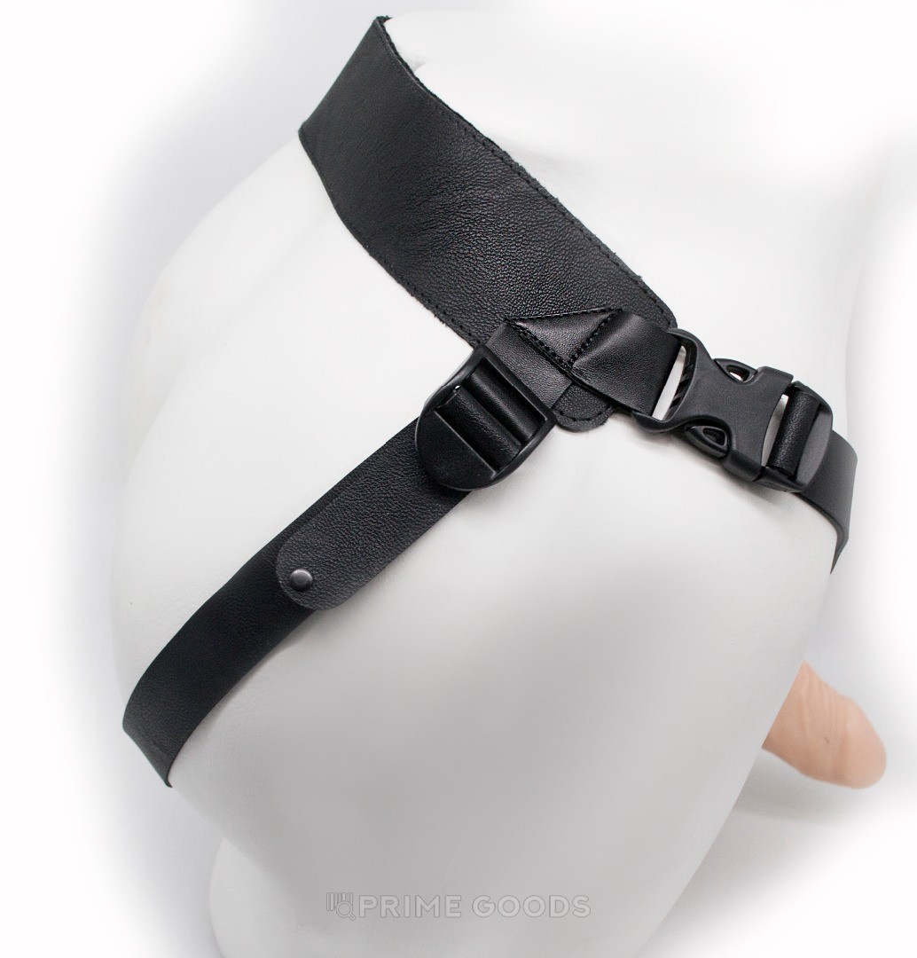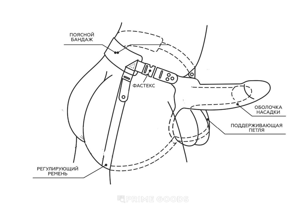 Пустотелый фаллоимитатор с бандажом выполнен из термоэластопласта на основе SEBS и медицинского вазелинового масла. Четыре кожаных ремешка позволяют надёжно закрепить изделие: два ремешка фиксируются вокруг мошонки с помощью полимерной петли, два — регулируются в талии при помощи пластиковых фастексов. Небольшой бандаж на пояснице обеспечивает комфорт при длительном ношении. При необходимости, после достижения эрекции нужной величины, фаллоимитатор легко снимается для продолжения акта без него.
