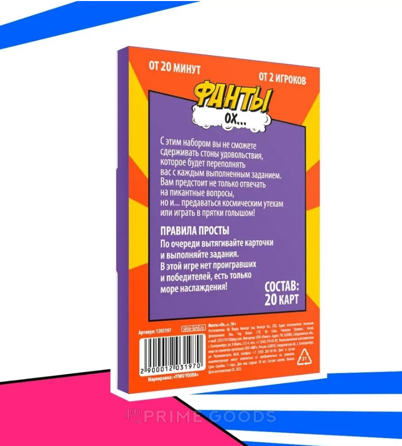 Фанты «Ох...», 20 карт, 18+ — откровенная игра для двоих, которая пробуждает страсть, развивает фантазию и превращает обычный вечер в чувственное приключение. Она создана для тех, кто хочет добавить в отношения больше азарта, флирта и взаимного влечения.
