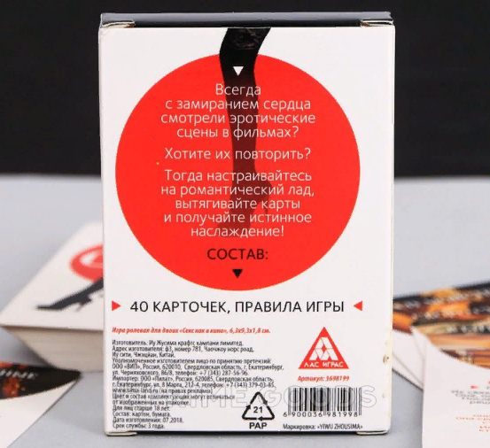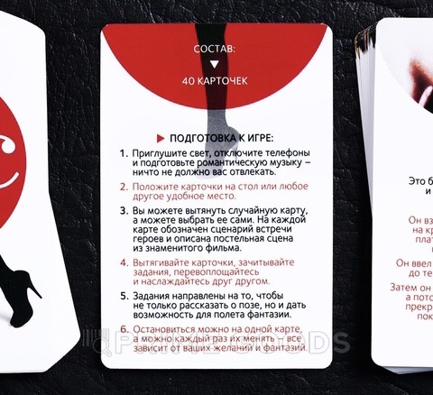 Приглушите свет, отключите телефоны и подготовьте романтическую музыку — ничто не должно вас отвлекать. Вы можете вытянуть случайную карту или выбрать из имеющихся. На каждой карте представлен сценарий встречи героев и описана постельная сцена из знаменитого фильма. Вытягивайте карточки, зачитывайте задания, перевоплощайтесь и наслаждайтесь друг другом. Задания подготовлены так, чтобы вы не только рассказали о позе, но и пофантазировали.
