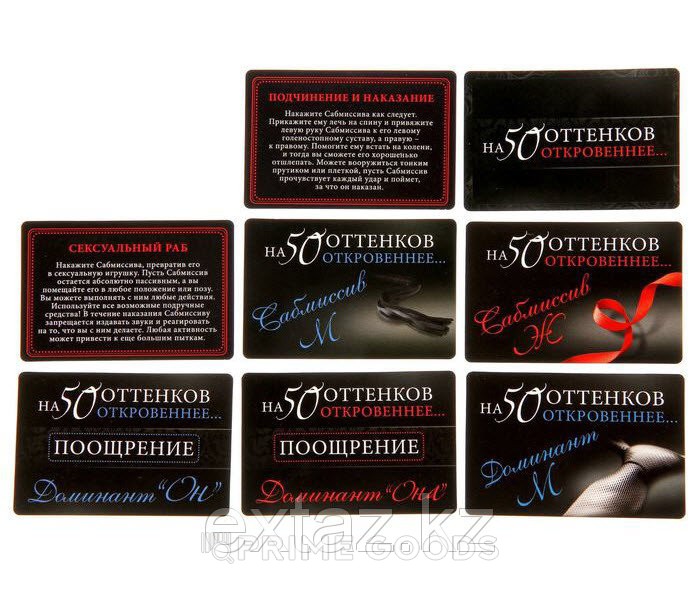 Разыграйте один из жарких ролевых сценариев. А после решите, поощрения или наказания заслуживает сабмиссив. Вытягивайте карточки из соответствующих колод и воплощайте все фантазии в жизнь!