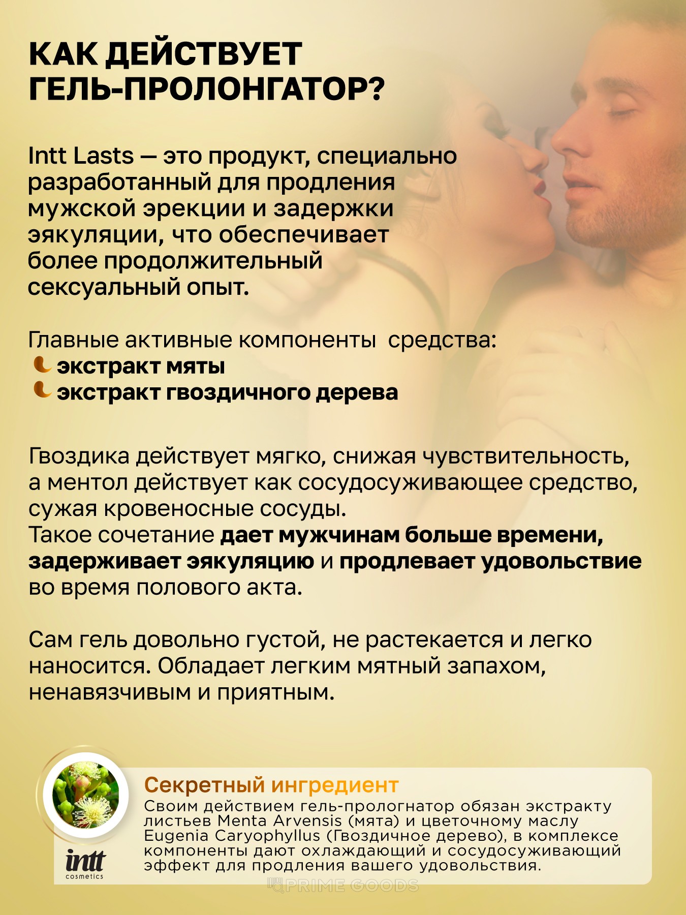 Гвоздика действует мягко, снижая чувствительность, а ментол действует как сосудосуживающее средство, сужая кровеносные сосуды. Такое сочетание дает мужчинам больше времени, задерживает эякуляцию и продлевает удовольствие во время полового акта.