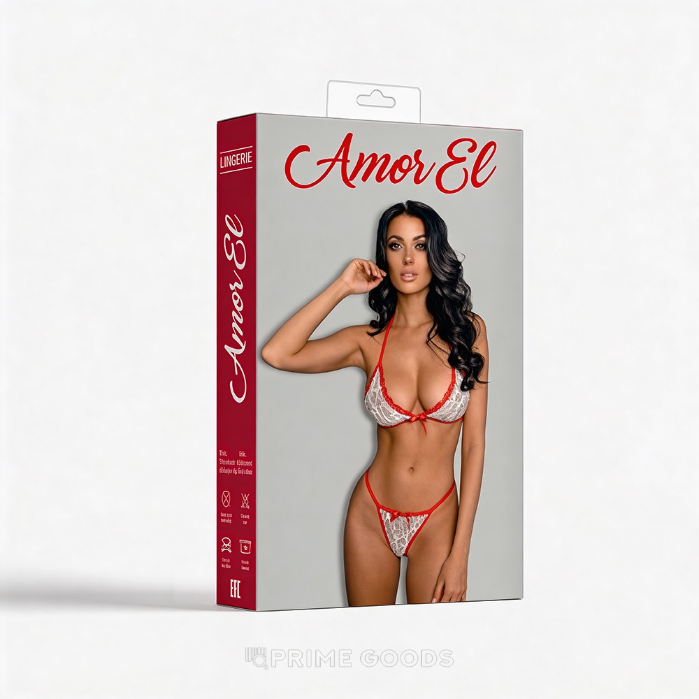 Комплект эротического белья Capagosa от Amor El — яркое сочетание нежного кружева и выразительных контрастов. Белоснежный бюстгальтер украшен красными бретелями, которые эффектно выделяют линию плеч, а ажурные стринги на мягкой красной резинке дополняют образ и подчёркивают силуэт.