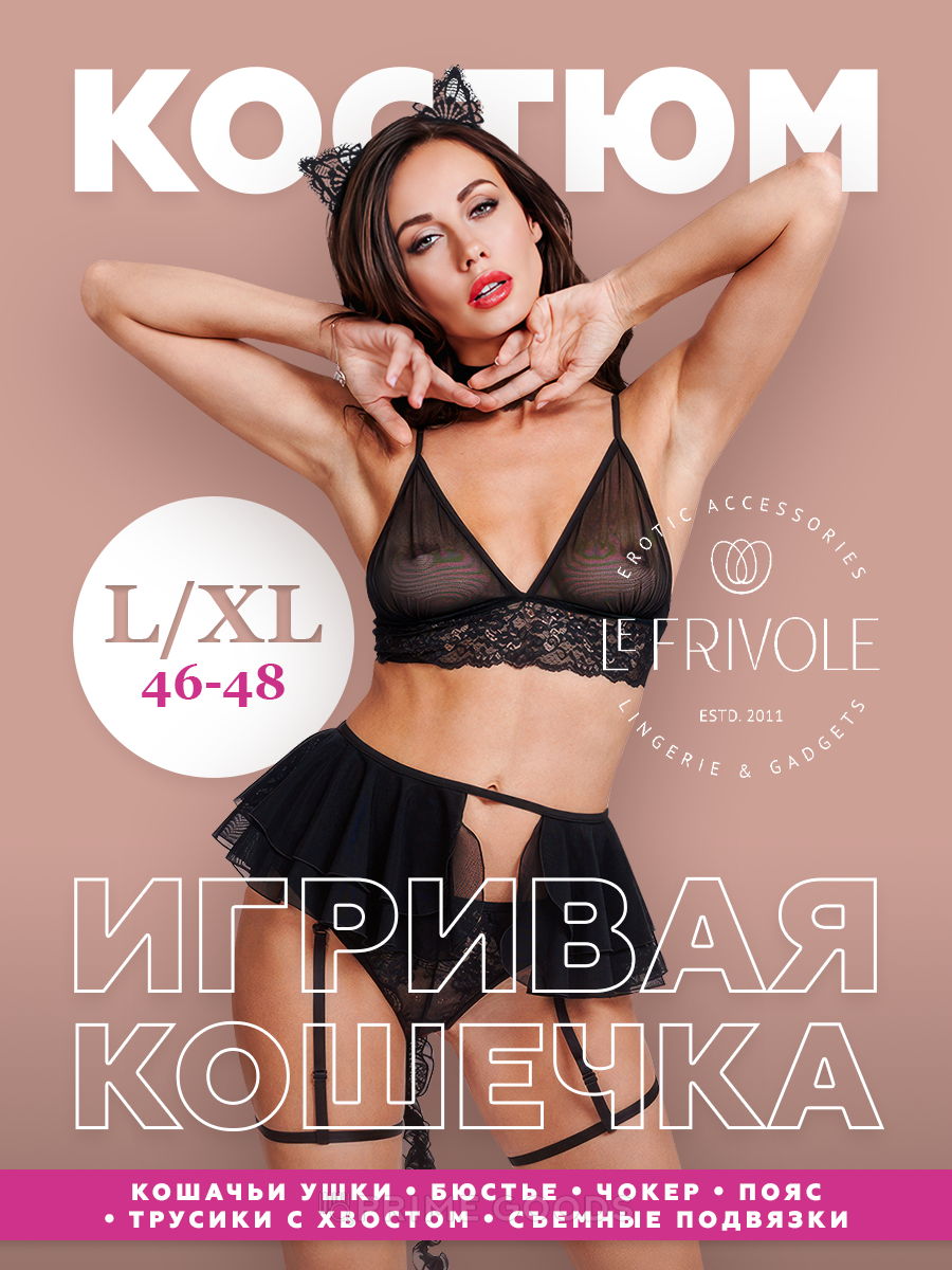 | В комплект входит | кошачьи ушки, бюстье, чокер, пояс, трусики с хвостом и съемными подвязками |
