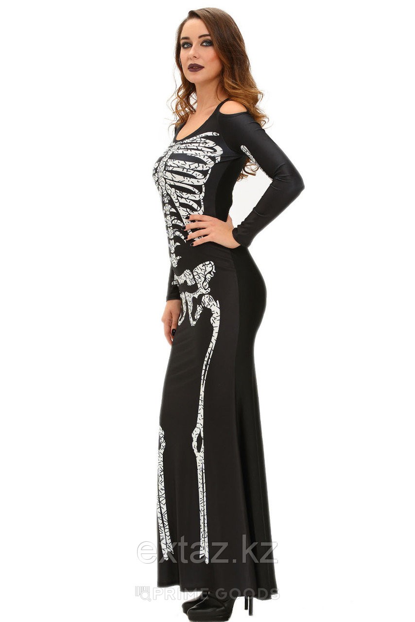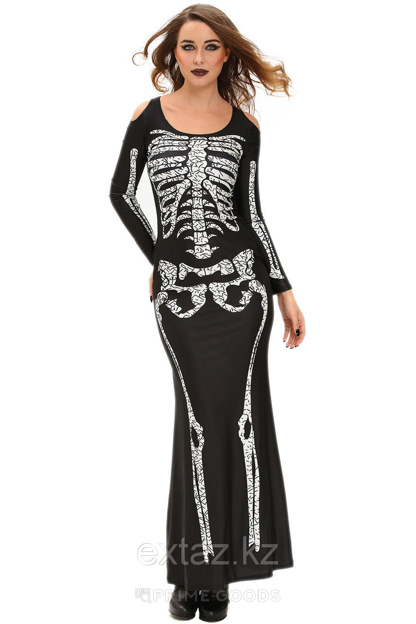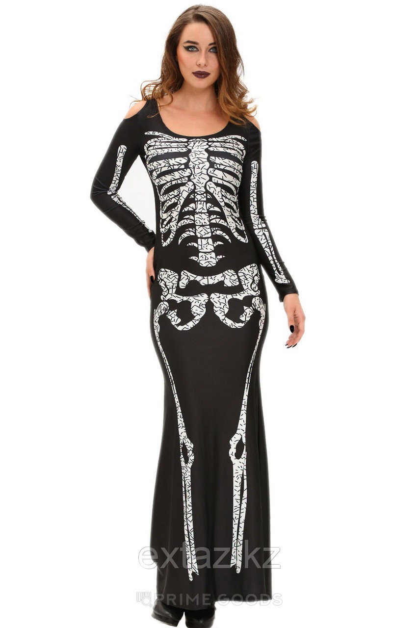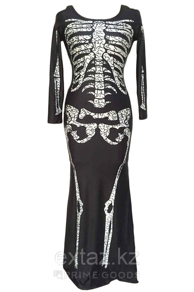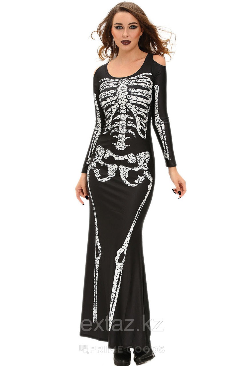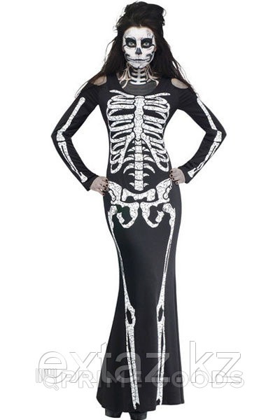 Это не просто наряд — это приглашение в мир фантазий, где реальность переплетается с игрой. Обтягивающее длинное платье с дерзким принтом скелета создано для тех, кто обожает быть в центре внимания на тематических вечеринках и не боится добавить немного ролевого огня в постельную жизнь.
