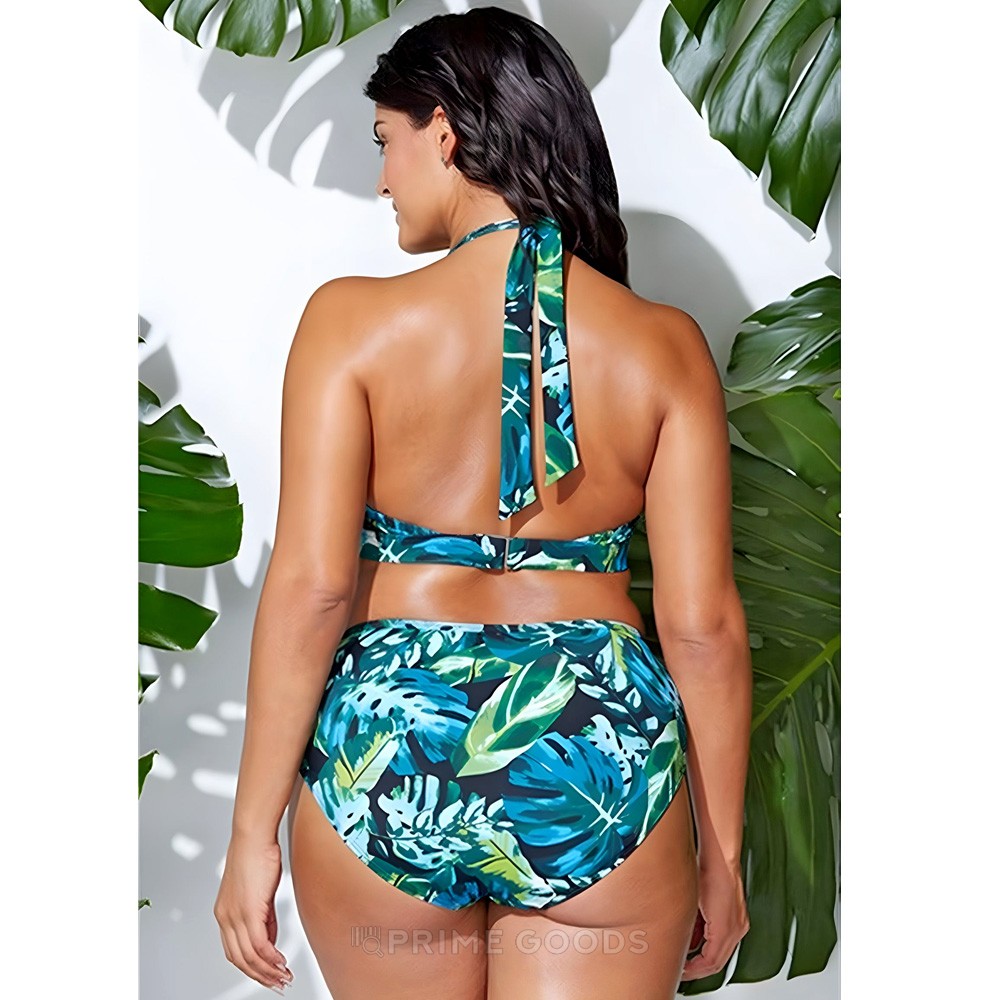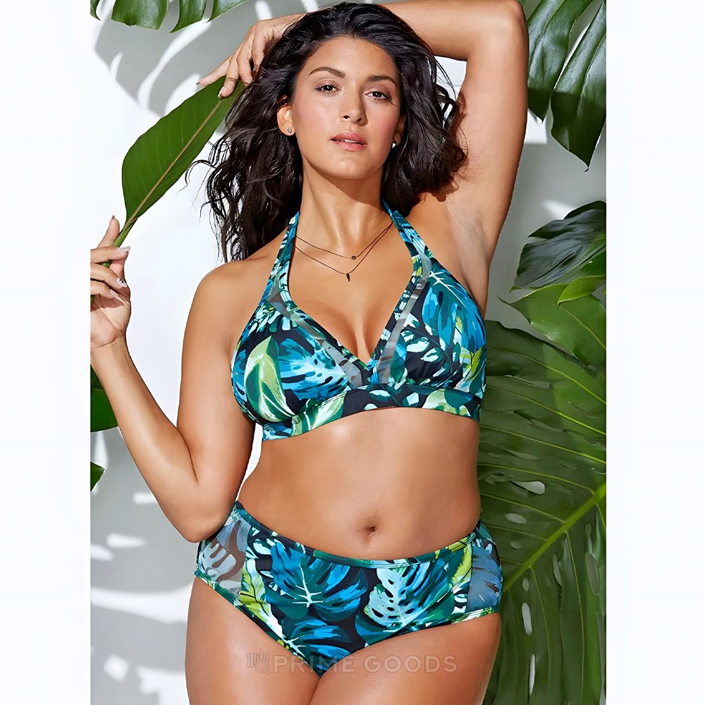 Купальник c красивым принтом из листьев для девушек plus size. Удобная модель, скрывающая недостатки фигуры. Купальник, в котором пышные формы будут выглядеть привлекательно! Топ на застёжке и завязке на шее. Трусики на высокой посадке. В дополнение к купальнику вы можете выбрать аквашузы у нас в интернет магазине!