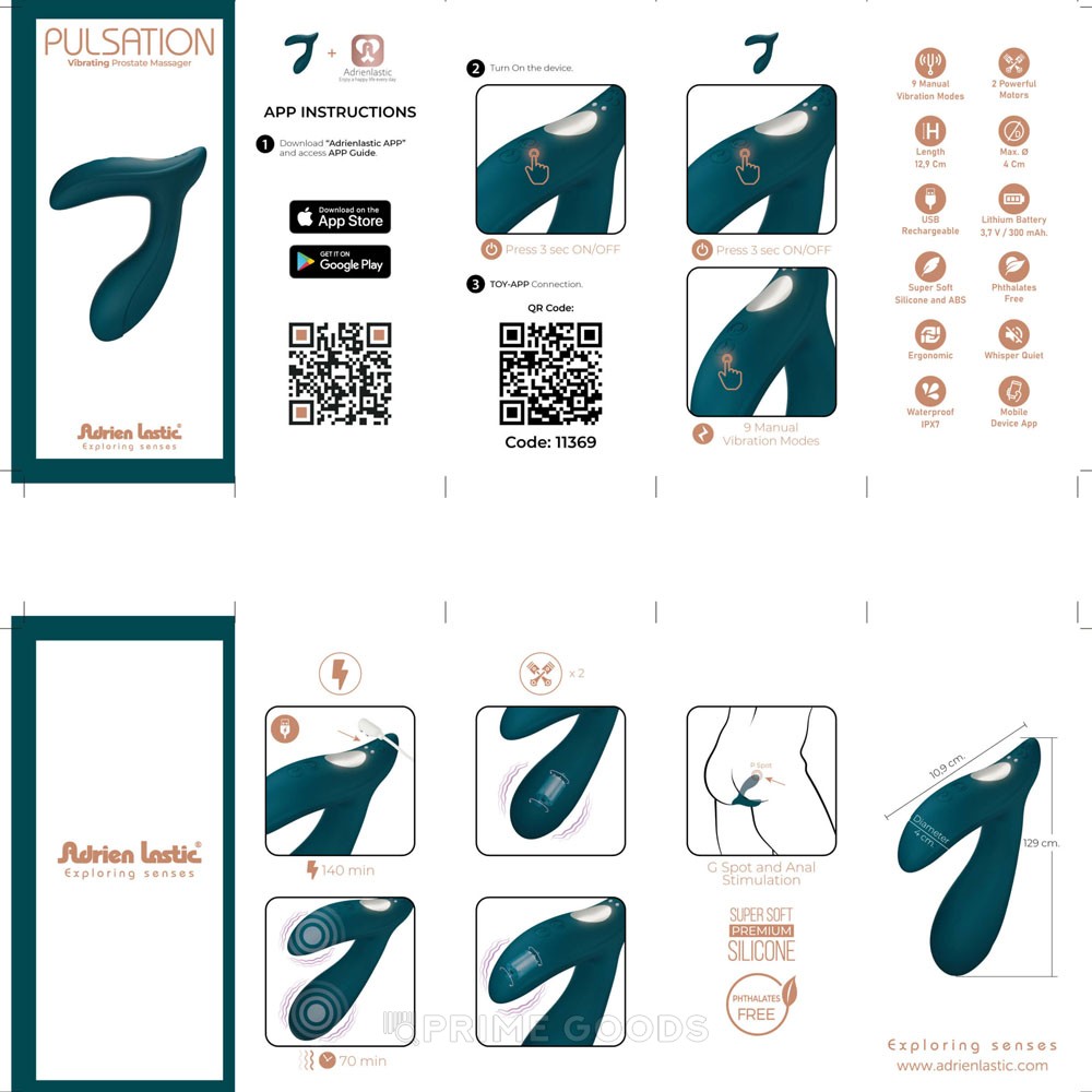 PULSATION — эргономичный массажёр простаты с двумя сверхтихими моторами и дистанционным управлением через мобильное приложение. Корпус из ультрамягкого силикона в сочетании с продуманной геометрией обеспечивает направленную вибрацию и комфортную посадку. Устройство водонепроницаемо по стандарту IPX7, перезаряжается через USB (встроенный аккумулятор 3,7 В / 300 мА·ч) и предлагает 9 режимов ручной вибрации, а также дополнительные режимы при управлении из приложения. Максимальный диаметр — до 4 см; длина — около 12,9 см.