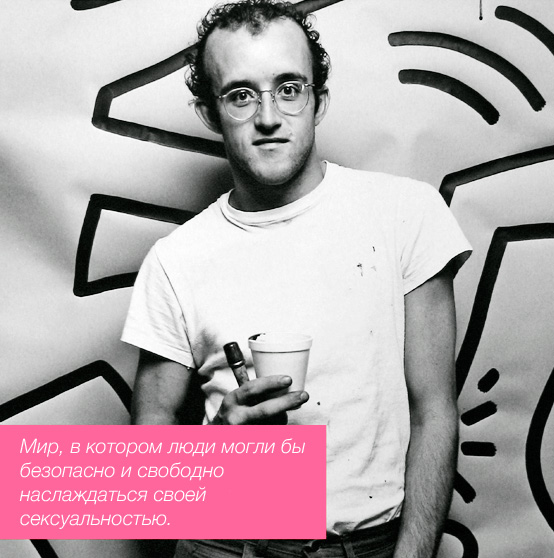 Keith Haring - популярный художник в Америке в 80-х, тесно дружил и сотрудничал с такими личностями как Жан Мишель Баския, Энди Уорхолом, Йоко Оно и Мадонной. Был открытым геем и доказывал важность безопасного секса. Но, несмотря на свою позицию, был болен СПИДом и к сожалению в 1990ом году скончался в связи с ухудшением здоровья по болезни.