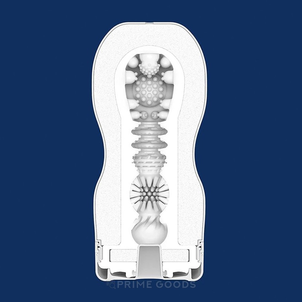 Корпус синего цвета — классическое решение Tenga с узнаваемой формой песочных часов. Такая геометрия обеспечивает естественное сжатие при введении и помогает удерживать комфортный уровень давления. В верхней части расположено отверстие для регулировки вакуума: при перекрытии клапана создаётся интенсивное всасывание, позволяющее регулировать ощущения простым движением руки.