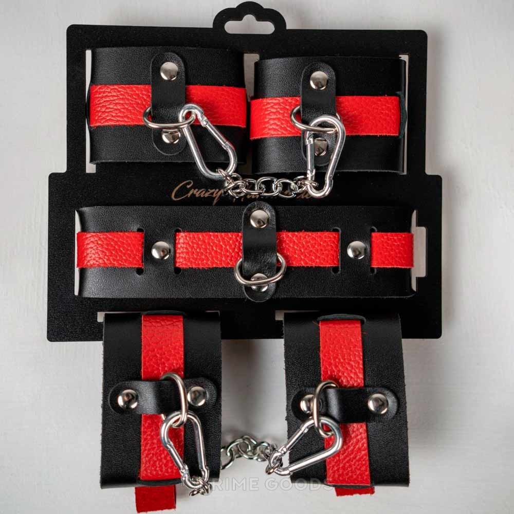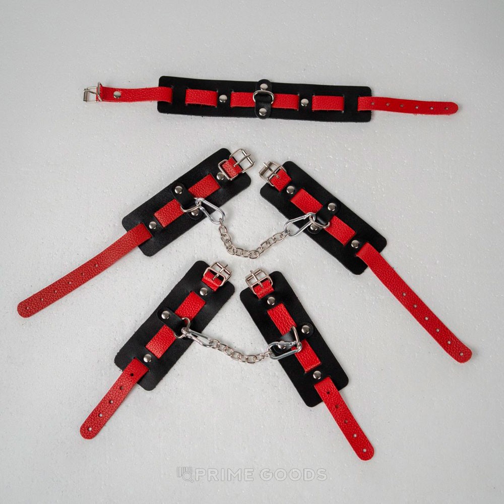 Наручники выполнены в аналогичном дизайне: основа из черной кожи и красный ремешок создают контраст, подчеркивающий уникальность изделия. Благодаря регулировке ремешка, наручники легко подстраиваются под нужный размер, обеспечивая комфорт и надежность. Прочные металлические кольца и соединительная цепочка с карабинами добавляют универсальности и функциональности.