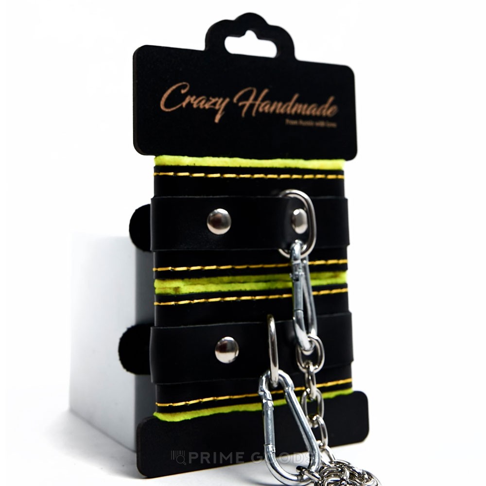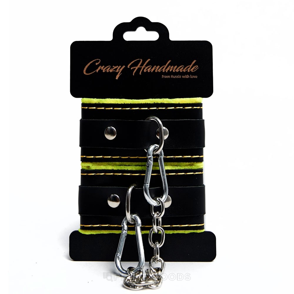 Наручники от Сrazy Handmade выполнены из прочной черной экокожи и дополнены яркой желтой мягкой подкладкой для комфортного прилегания к коже. Контрастная декоративная прострочка подчеркивает стильный дизайн. Наручники оснащены надежными металлическими креплениями и цепочкой с карабинами, что позволяет легко соединять и фиксировать их. Благодаря округлой форме и мягкому внутреннему слою, аксессуар удобно сидит на запястьях, сочетая в себе надежность и комфорт при использовании.