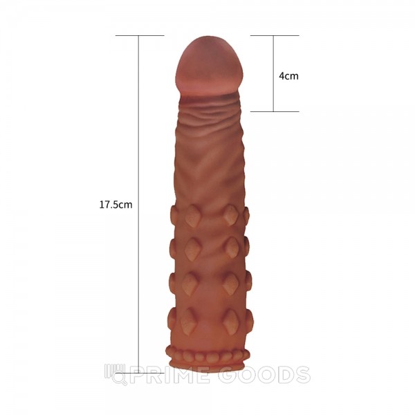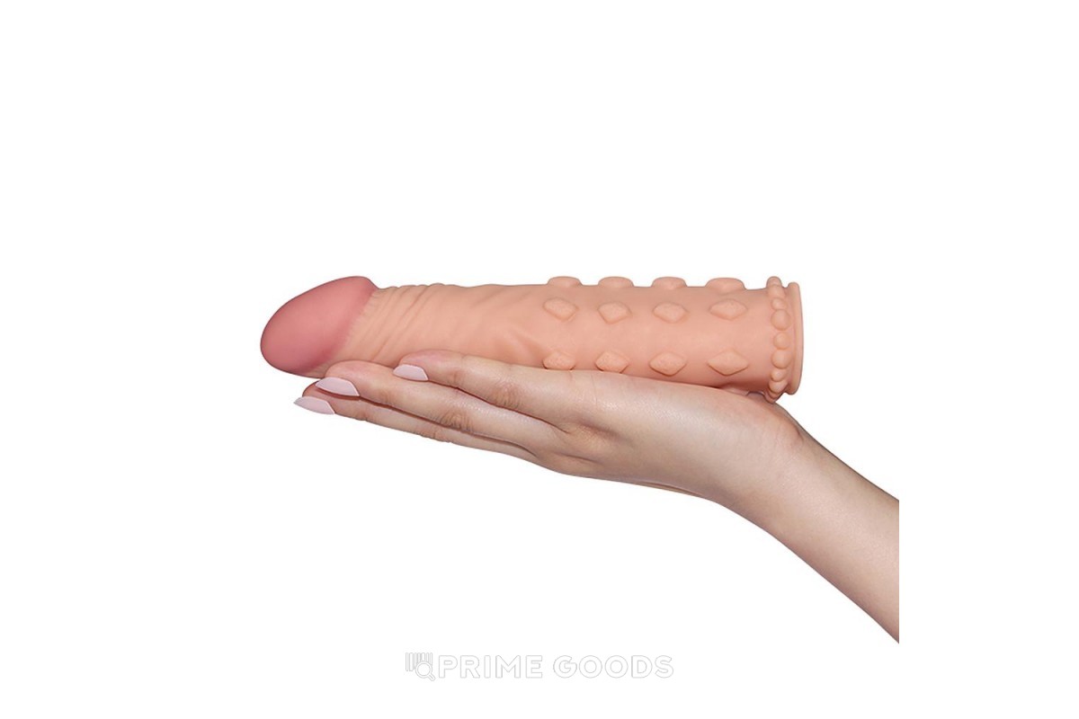 Реалистичная насадка-удлинитель добавляет длину и ощутимое утолщение за счёт равномерной толщины стенок. Кончик оформлен округлой головкой с уплотнением для мягкого входа; по корпусу выполнены вены и мелкие бугорки для выраженного рельефа. Внутренняя полость эластичная и тянется, что помогает плотно зафиксировать насадку и удерживать стабильный ход движений. Заявленная прибавка: до ~30% по длине и около 2,5 см по диаметру в широкой зоне.