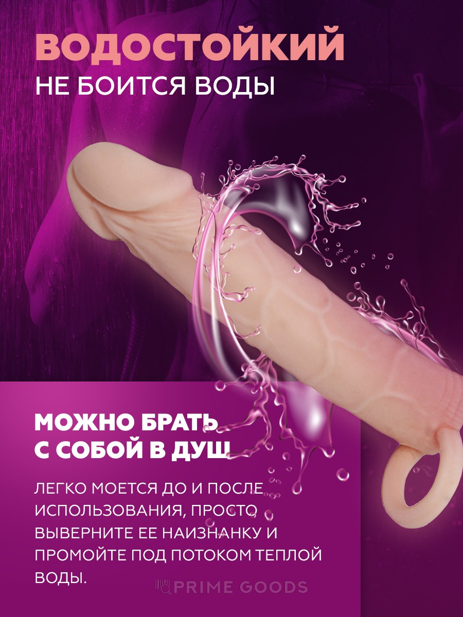 Эта модель оснащена специальным кольцом, фиксирующимся на мошонке, что надёжно удерживает насадку во время использования и повышает контроль над процессом. Продукт также можно использовать как многоразовый презерватив. Материал приятный на ощупь, гибкий и простой в уходе — достаточно вывернуть его наизнанку и промыть под тёплой водой.