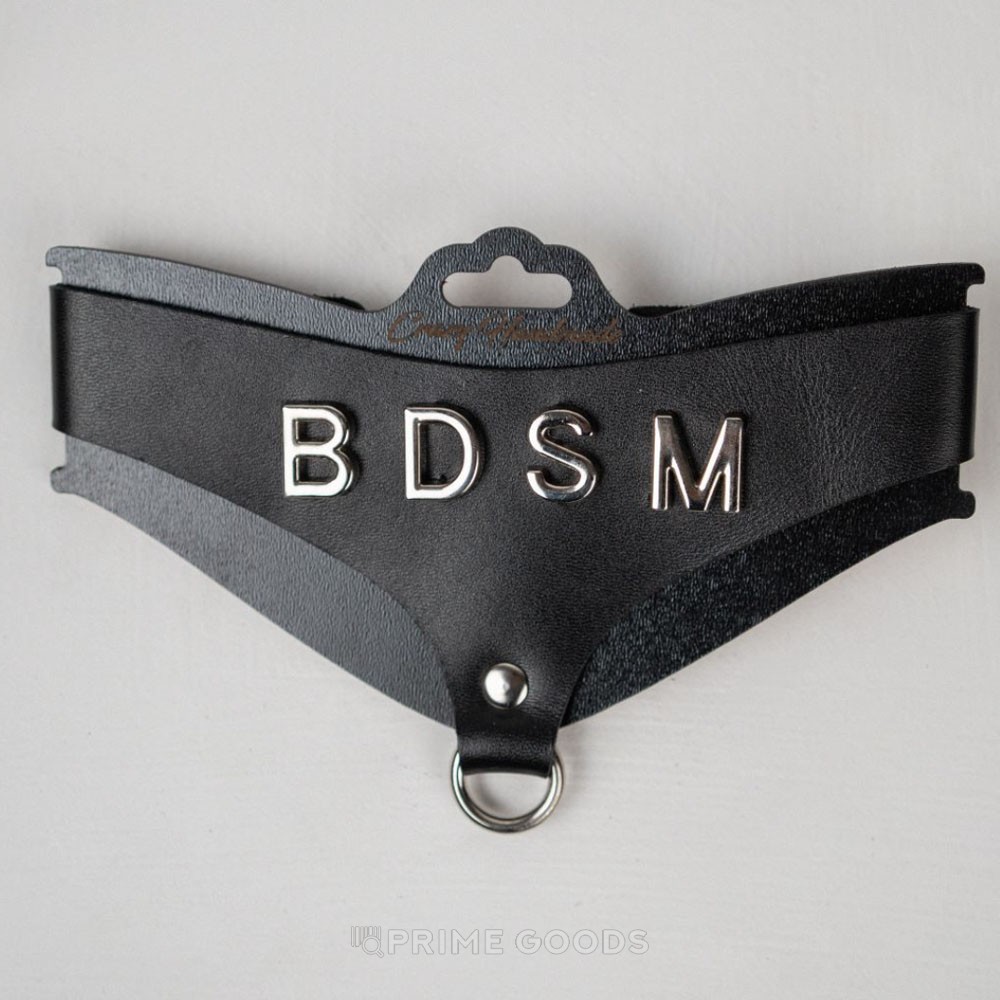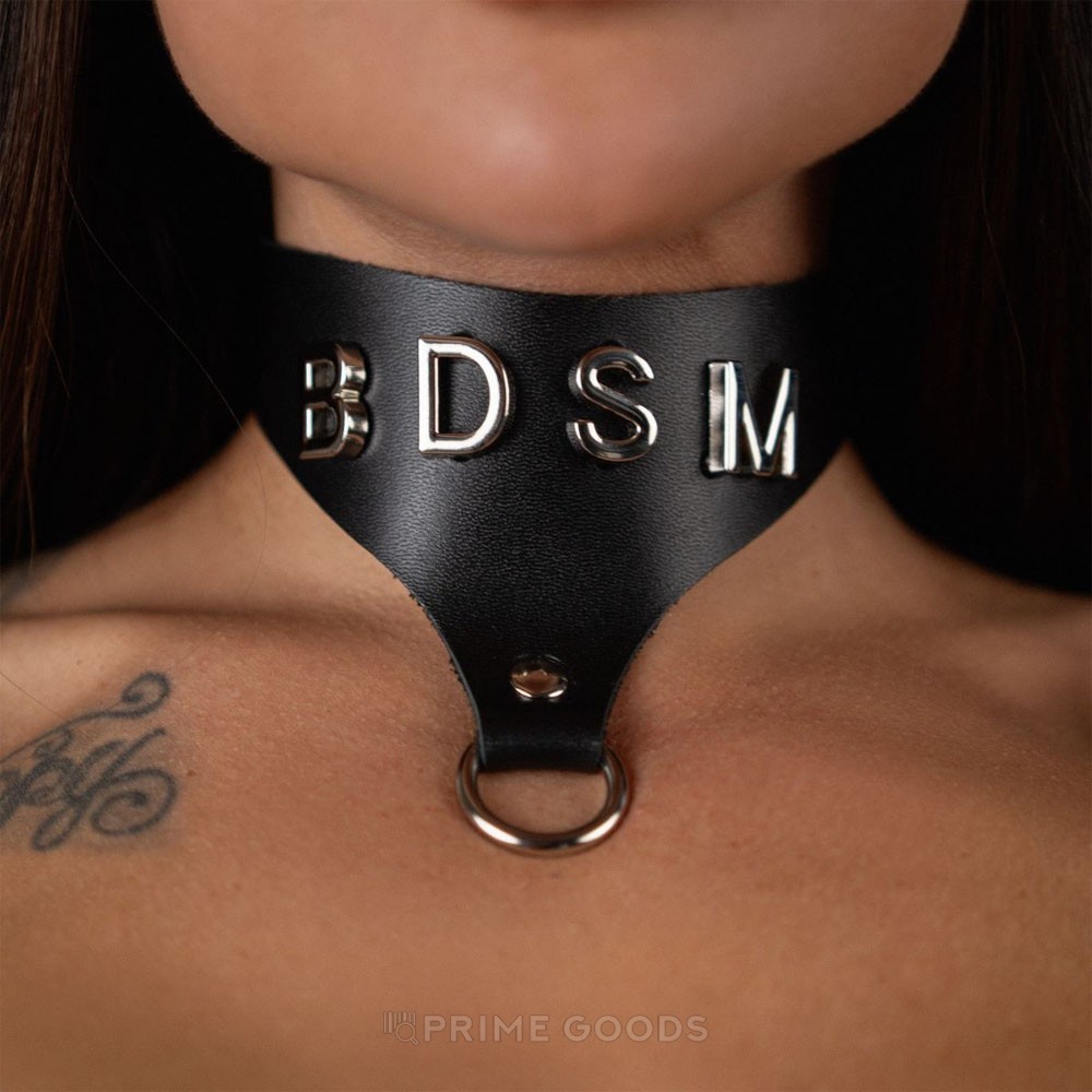 Однослойный кожаный ошейник треугольной формы с аккуратным акцентом из букв «BDSM» на фурнитуре премиального качества. В нижней части расположен стальной хромированный кольцевой элемент для крепления аксессуаров. Модель поставляется на фирменной деревянной подложке — удобно для хранения и презентации.