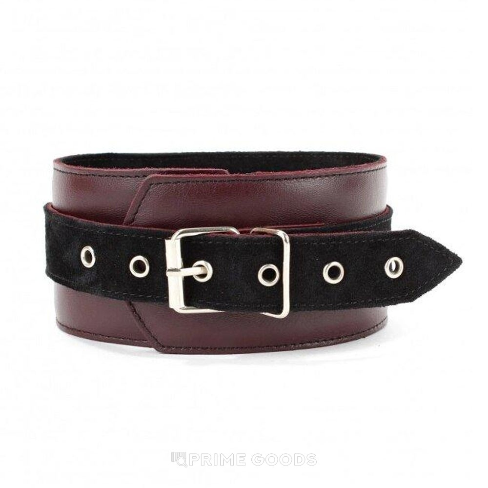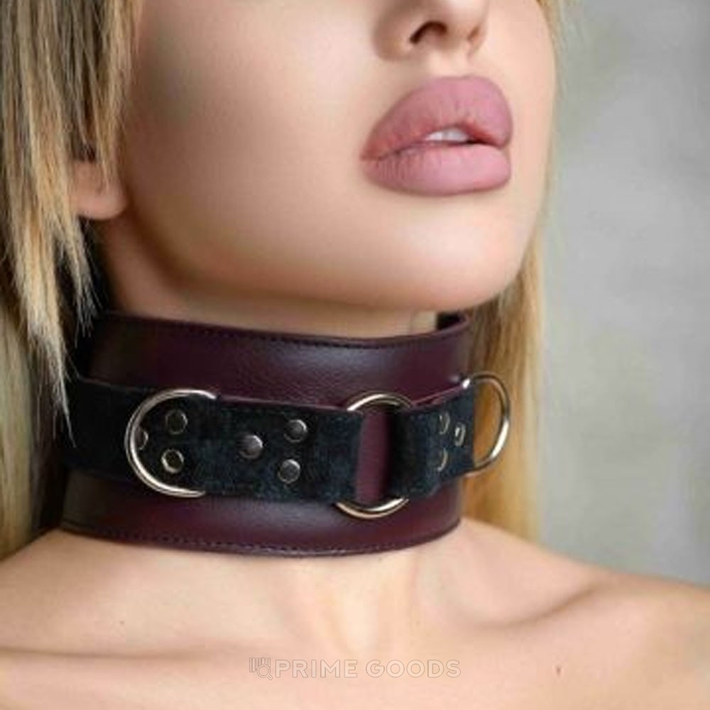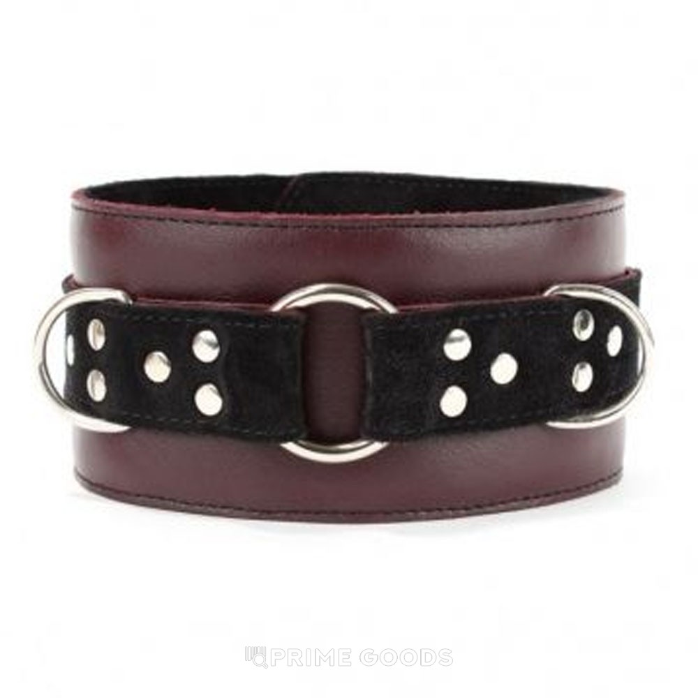 Бордовый кожаный ошейник — аксессуар для ролевых образов и BДСМ-практик. Выполнен из натуральной кожи, декорирован вставкой из чёрной замши, заклёпками и центральным металлическим кольцом с двумя полукольцами. Пряжка сзади обеспечивает надёжную фиксацию и удобную регулировку по размеру.
