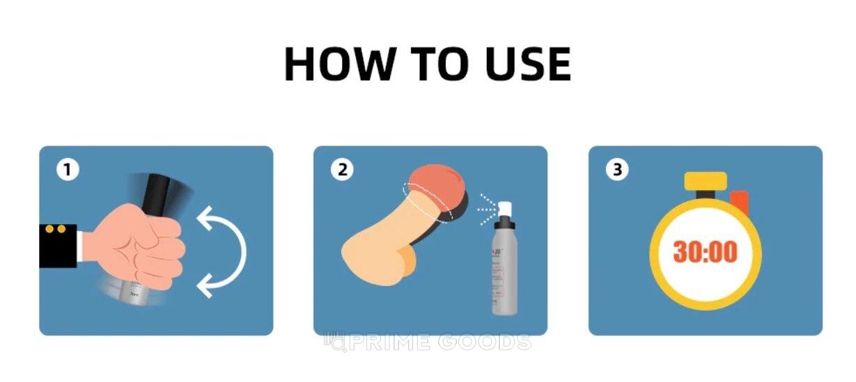 Перед применением встряхните флакон, распылите его за 30 минут до полового акта на головку члена 2-3 раза и втирайте до полного высыхания. Наносите спрей на чистые половые органы, избегайте попадания в глаза и не смешивайте с другими препаратами.