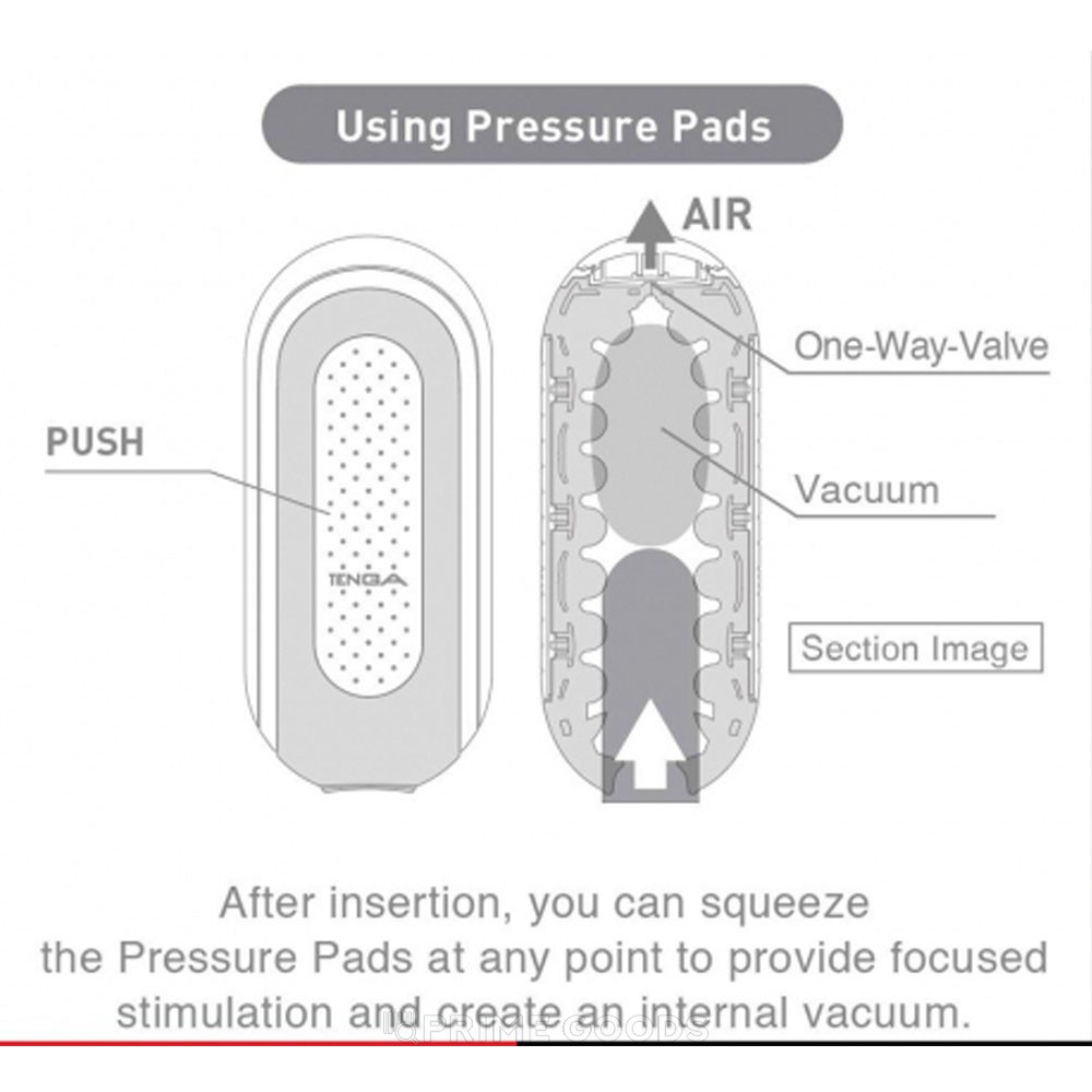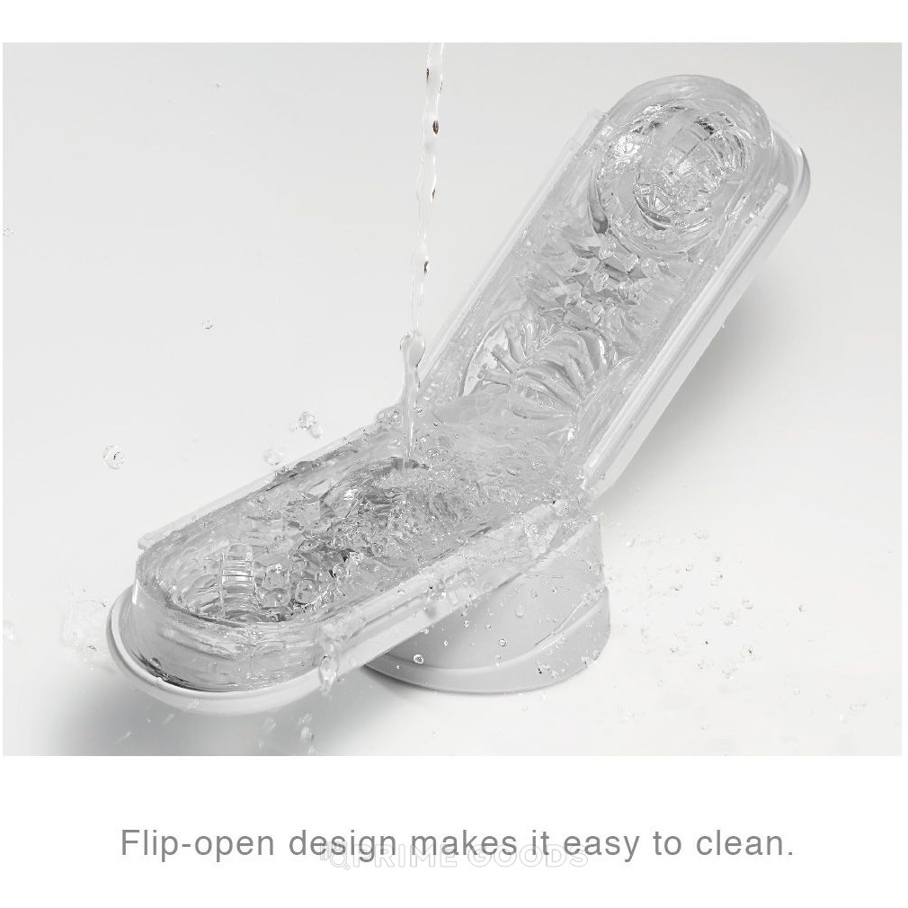 Благодаря конструкции «Flip» мастурбатор легко открывается на 160° для удобной очистки и нанесения смазки. Герметичная вставка предотвращает вытекание лубриканта и служит подставкой для просушки. Боковые кнопки позволяют создавать вакуум одним нажатием, усиливая ощущение плотного обхвата.