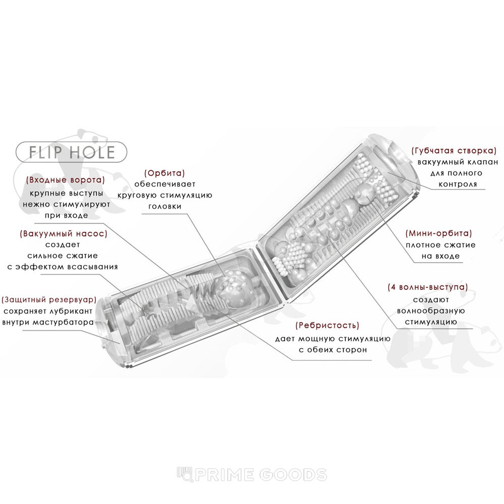 TENGA Flip Hole White — премиальный многоразовый мастурбатор с раскладывающимся корпусом. Конструкция «flip» упрощает гигиену: внутренняя часть полностью раскрывается для промывки и сушки. Внутренний канал выполнен из термопластичного эластомера (ТПЭ) с многоуровневым рельефом. Текстуры распределены секциями для разных типов давления и контакта по длине: зоны с выступами, ребристые участки и сферические элементы формируют различающиеся ощущения при поступательных движениях.