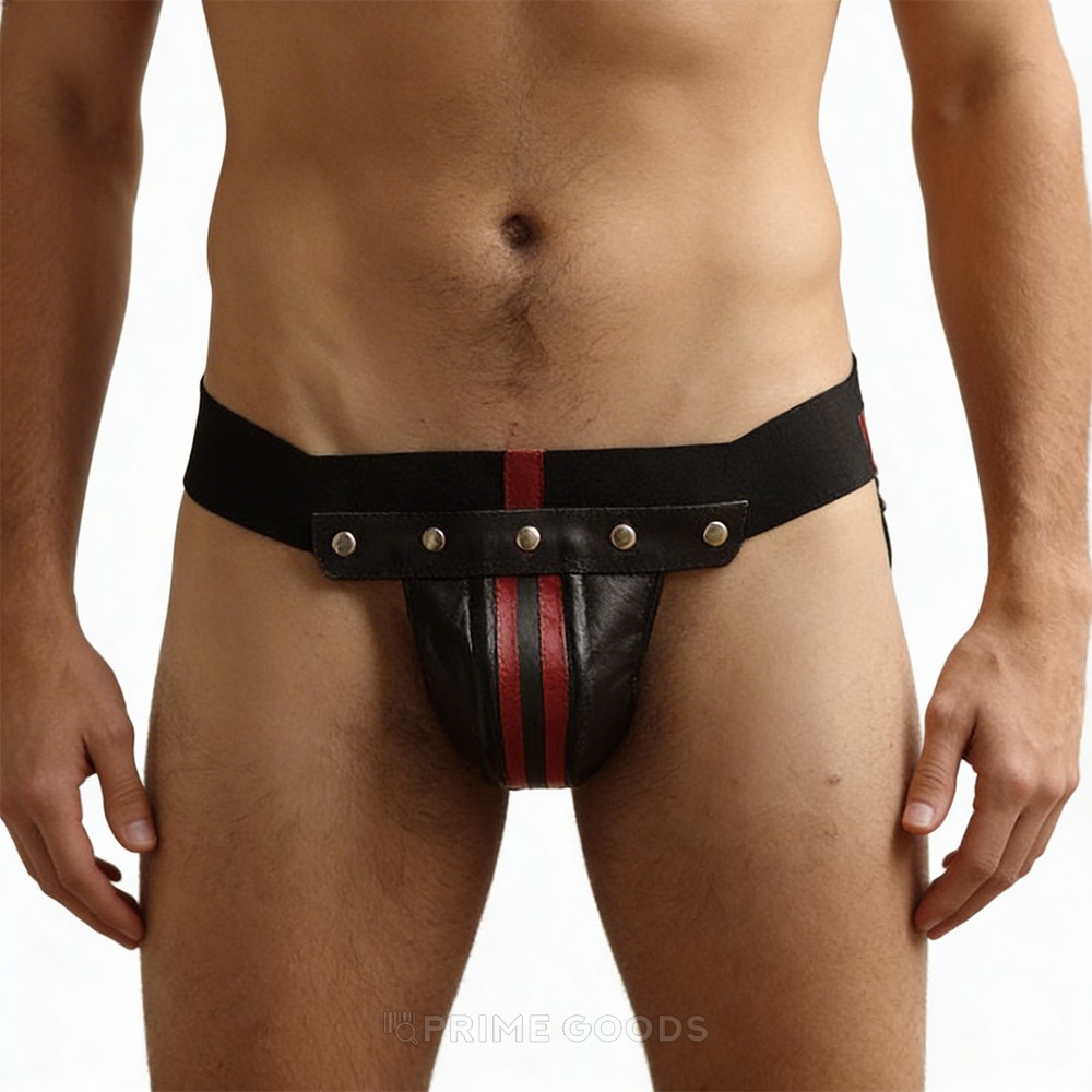 Отстегивающаяся передняя деталь обеспечивает мгновенный доступ, добавляя удобства и интриги. Эластичные резинки гарантируют легкость в надевании и комфортное прилегание, а пуш-ап эффект передней части подчёркивает мужественность и создаёт выразительный силуэт. Декоративные полосы из красной кожи добавляют яркий акцент и делают этот аксессуар по-настоящему уникальным.