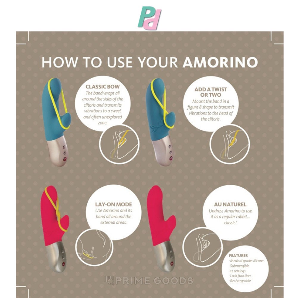 Amorino вибратор - кролик с отростком для одновременной вагинальной и клиторальной стимуляции. Изогнутая форма основного ствола для глубокой стимуляции точки G. И словно тетива на луке, на вибраторе натянута силиконовая желтая резиночка. Ее главная задача - увеличить охват стимуляции, а именно область между клитором и входом в вагину, а возможно и половые губы. Можно скрутить резинку и надеть один конец на отросток, а второй на основной ствол. Во время стимуляции резинка ощутимо проводит вибрацию и эффект ощущается с первых минут. Также, можно использовать резинку как и эрекционное кольцо и даже для стимуляции сосков.
