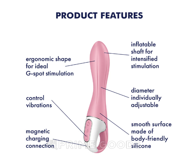 Корпус устройства выполнен из бархатистого силикона премиум-класса и имеет стильный розовый оттенок. При нажатии кнопки верхняя часть вибратора плавно наполняется воздухом и увеличивается в диаметре до 15 мм, создавая эффект наполненности. Это ощущение дополнительно усиливается благодаря 12 мощным режимам вибрации, воздействующим точно и уверенно, но при этом бесшумно.