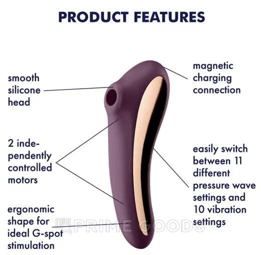 Перезаряжаемый вибромассажёр из приятного на ощупь, гипоаллергенного силикона в фиолетовом цвете. Модель совмещает два типа воздействия: воздушно-волновую (вакуумную) стимуляцию и вибрацию. В корпусе расположены два тихих мотора с независимым управлением режимов: до 11 вариантов вибрации и до 11 режимов воздушных импульсов. Форм-фактор подходит как для сольных сценариев, так и для прелюдии в паре, когда важны аккуратные ощущения и удобное управление.